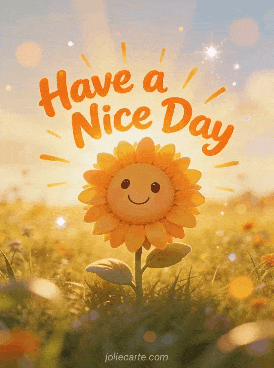 Share some sunshine with this cheerful have a nice day card featuring a cute smiling sunflower in a sunny field. Also discover a lovely day greeting, a kisses have a nice day card or a hello have a nice day card.