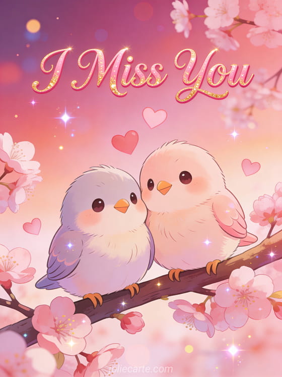 Send a tender I miss you greeting to let someone special know they are in your thoughts. Discover also a missing you card, a I miss you my love card or a I miss you gif.