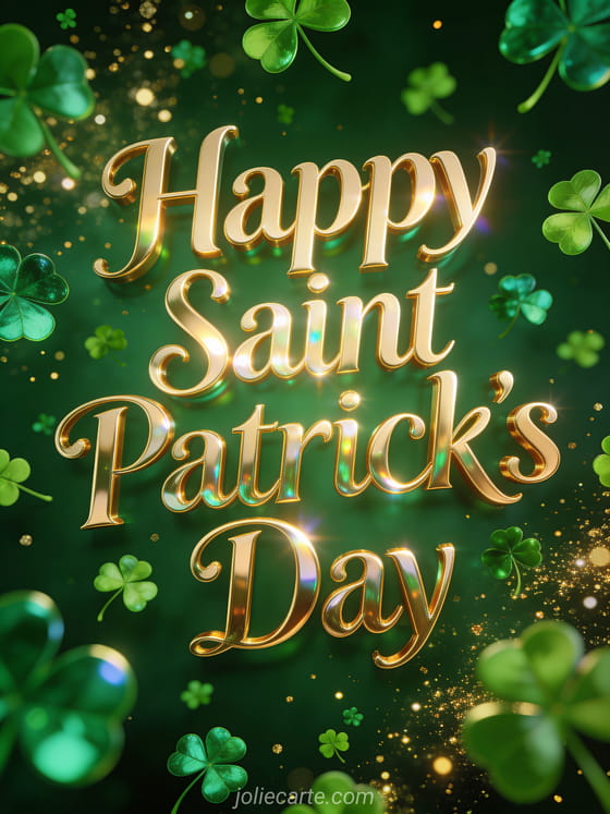 Celebrate Saint Patrick's Day with this elegant greeting card featuring golden letters surrounded by a rain of emerald four-leaf clovers and sparkling golden particles. Discover also a humorous Saint Patrick card, a funny Saint Patrick card or a Saint Patrick card.