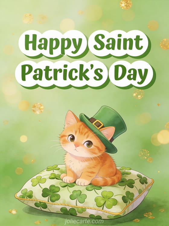 Celebrate Saint Patrick's Day with this adorable greeting card featuring a playful ginger kitten wearing a tiny leprechaun hat on a cushion of fresh shamrocks. Discover also a humorous Saint Patrick card, a Saint Patrick card or a good morning Saint Patrick card.
