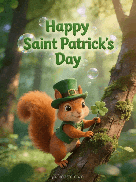 Happy Saint Patrick's Day a cheeky squirrel in a leprechaun hat holding a four-leaf clover