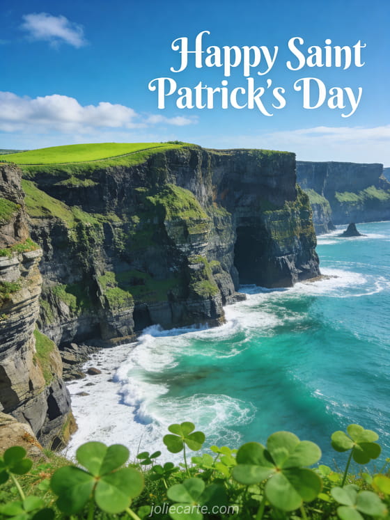 Celebrate Saint Patrick's Day with this breathtaking greeting card featuring spectacular Irish coastal cliffs plunging into a turquoise sea with wild shamrocks in the foreground. Discover also a happy Saint Patrick card, a humorous Saint Patrick card or a funny Saint Patrick card.