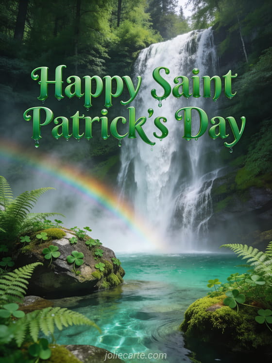 Celebrate Saint Patrick's Day with this stunning greeting card featuring a majestic Irish waterfall surrounded by ferns and shamrocks. For more festive greetings, discover a free Saint Patrick greeting card or a Saint Patrick's Day card.