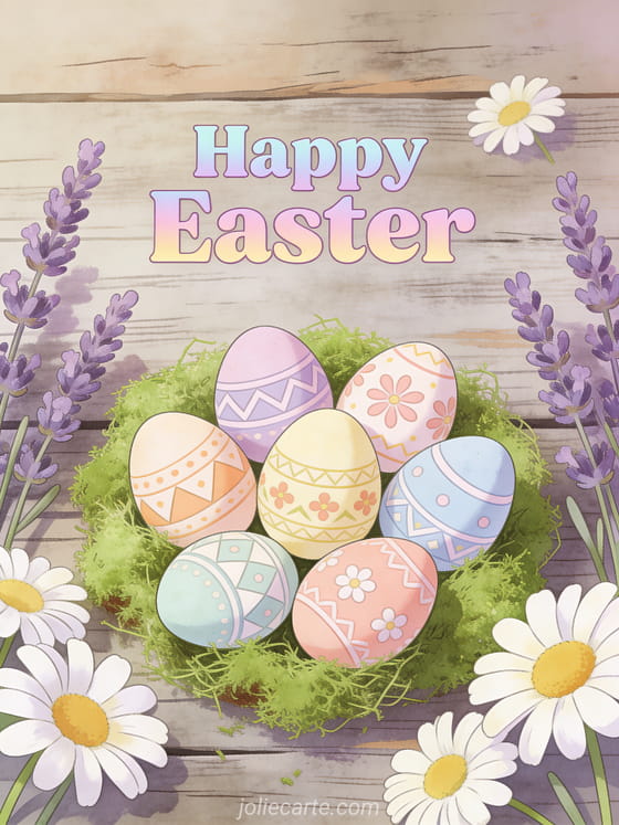 Send this cheerful Happy Easter greeting featuring beautifully painted eggs with geometric and floral patterns arranged in green moss with lavender and daisies. Discover also an Easter text card or an Easter wishes card.