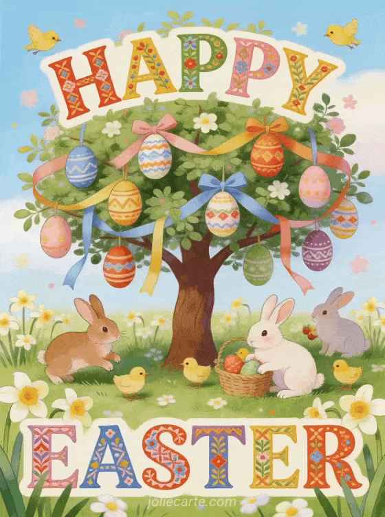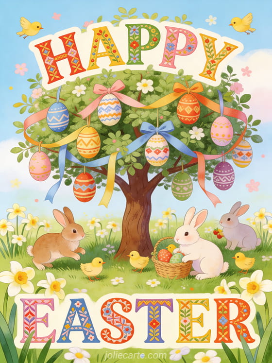 Send joyful Easter wishes with this charming folk art greeting card. Discover also a free Easter image to download and celebrate the holiday with warmth and cheer.
