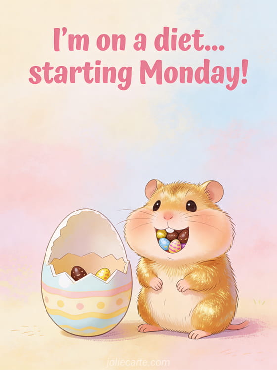 Share a good laugh this Easter with this hilarious card about diets and chocolate eggs. The perfect way to wish a funny Easter to anyone who loves chocolate a little too much.