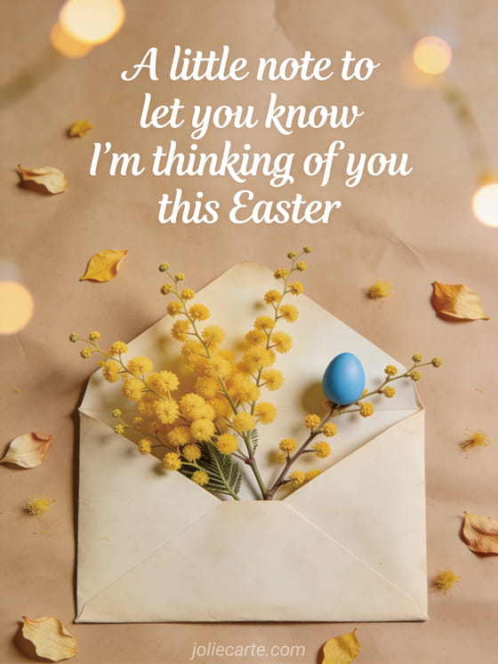 Send this gentle Easter greeting to let someone know they are in your thoughts. A nostalgic illustration with mimosa and a vintage envelope. Discover also an Easter wishes card or an Easter message for a friend.