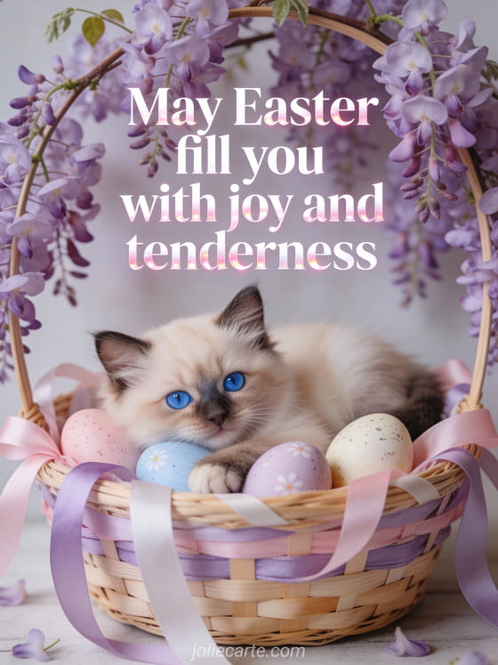 Share this sweet Easter greeting featuring a ragdoll cat surrounded by wisteria and painted eggs. A photorealistic illustration full of tenderness. Discover also an Easter thinking of you card or an Easter wishes card.
