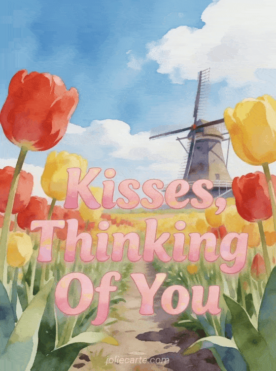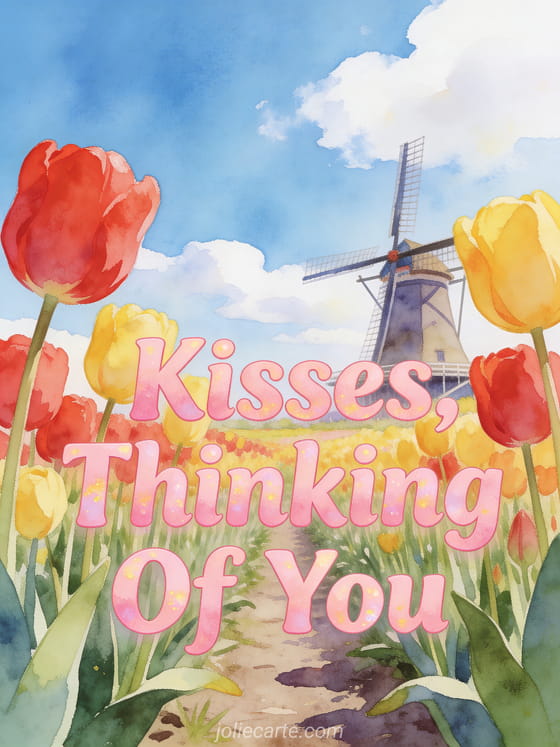 Send this joyful greeting card featuring colorful red and yellow tulips in a spring field with a Dutch windmill. Discover also a thinking of you my darling card or a thinking of you my love card.