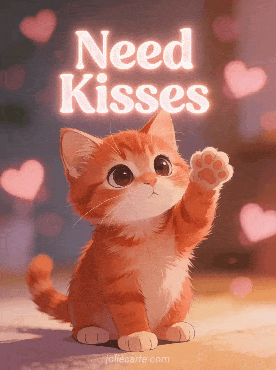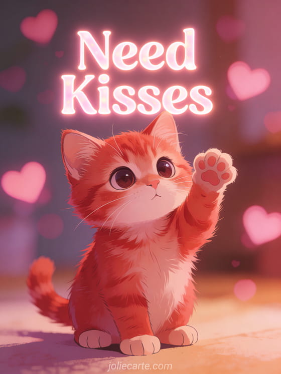 Send a sweet need kisses greeting to someone you love with this adorable card. A cute ginger kitten with big tender eyes reaches out its paw as if asking for a cuddle, with pink heart bokeh in the background. Discover also a big kisses cats card or a hugs and kisses card.
