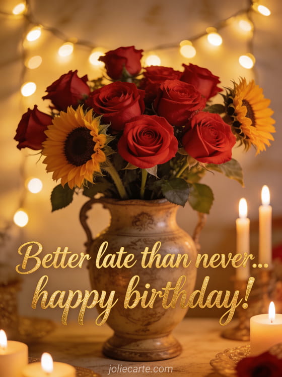 Better late than never! Send warm birthday wishes with this beautiful card featuring sunflowers and candles. Discover also a belated birthday ecard or a belated birthday greeting card.