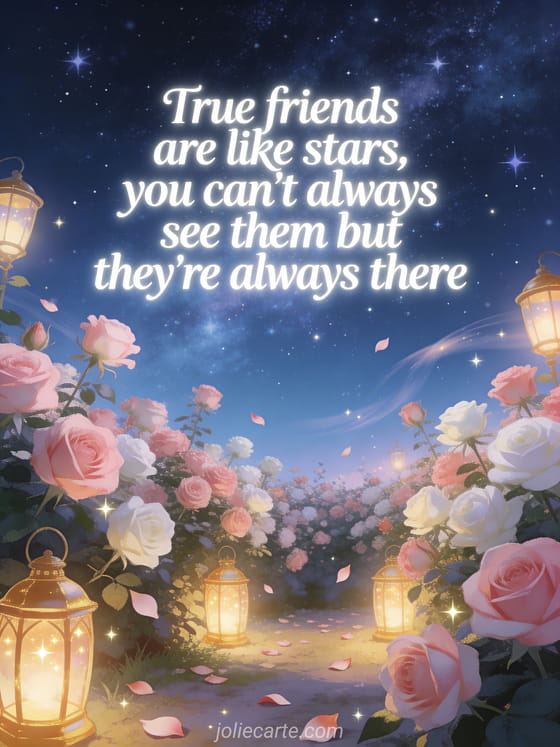Celebrate a friend's birthday with this enchanting card featuring luminous white letters under a starry sky above a rose garden lit by lanterns, in a magical atmosphere. Also discover a birthday card for friend appreciation or a vintage birthday ecard.