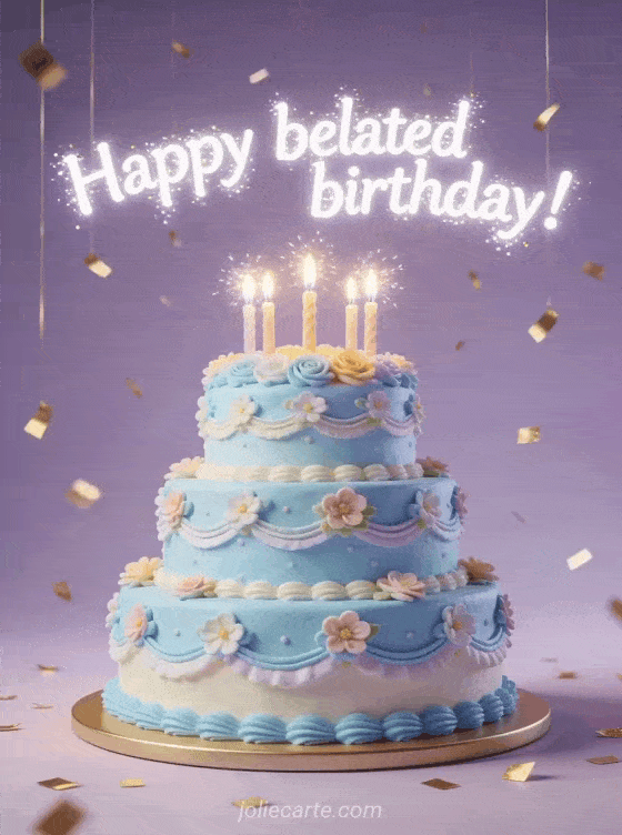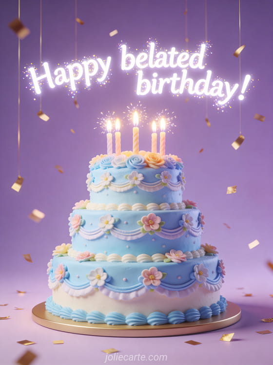 Send a joyful happy belated birthday greeting with this festive card featuring a cake, candles and confetti. Discover also a funny belated birthday card or a belated birthday card with apology.