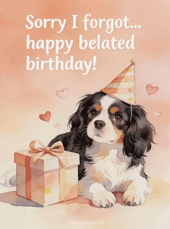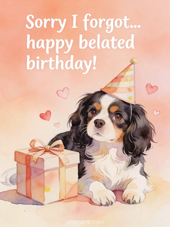 Say sorry for forgetting with this tender belated birthday card featuring a Cavalier King Charles spaniel, hearts and a gift. Discover also a belated birthday card with flowers or a humorous belated birthday card.
