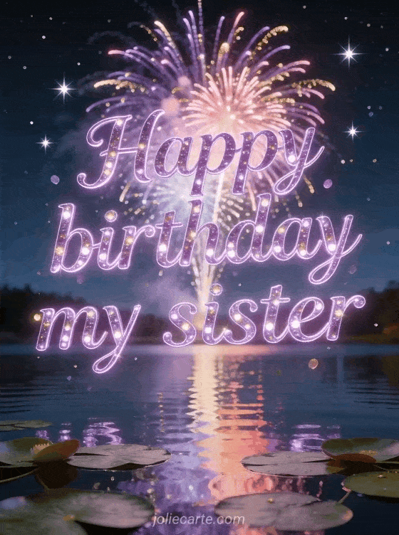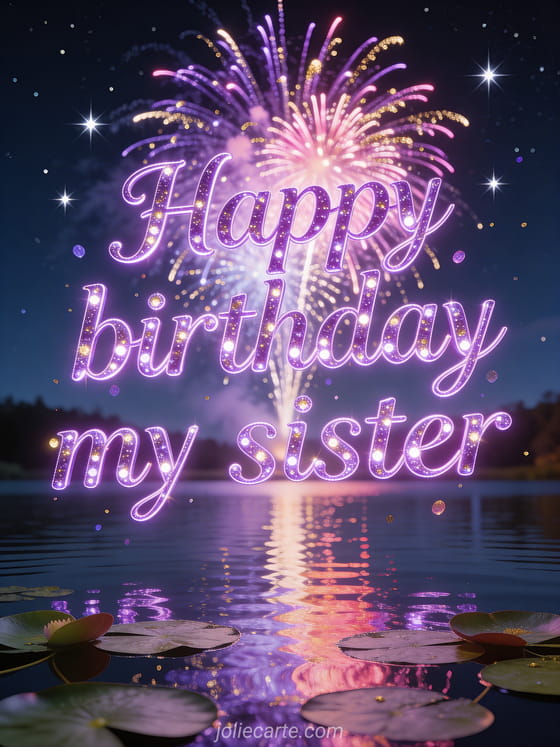 Celebrate your sister's birthday with this stunning free greeting card. Spectacular purple, pink and golden fireworks over a calm lake with colorful reflections and sparkling stars. Discover also a funny happy birthday sister card or a birthday sister ecard or a birthday ecard for sister.