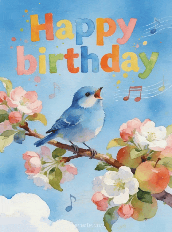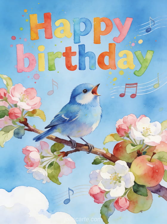 Celebrate a birthday with this charming free greeting card. An adorable blue tit singing joyfully on a blooming apple tree branch with musical notes, watercolor style letters and a bright blue sky. Discover also a happy birthday sister card or a birthday sister card or a happy birthday sister humor card.