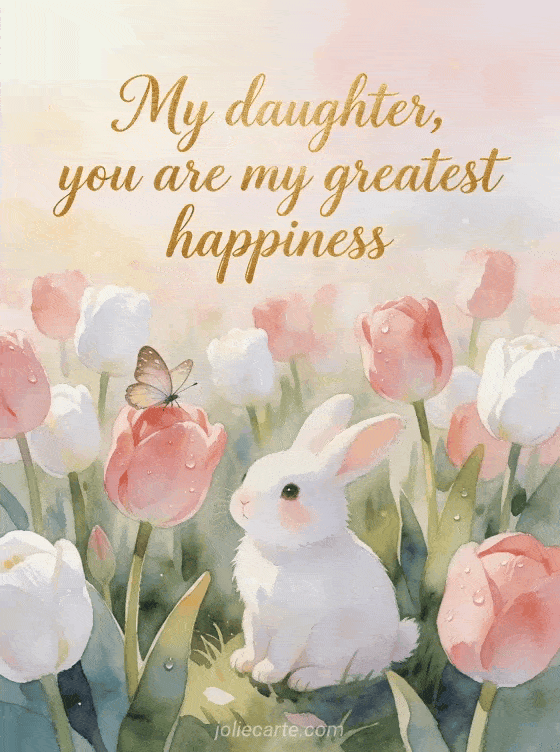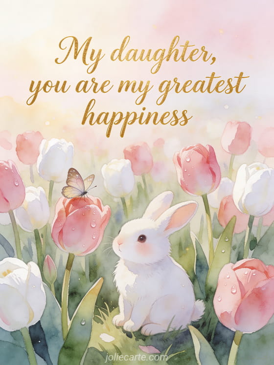Celebrate your daughter's birthday with this adorable watercolor card featuring a white rabbit sitting among pink tulips with a butterfly. Discover also a birthday card for daughter from mom or a happy birthday my daughter I love you card.