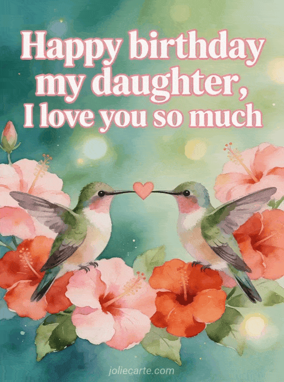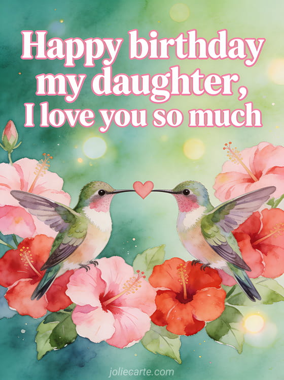 Send a touching birthday greeting to your daughter with this beautiful watercolor card featuring two hummingbirds forming a heart with their beaks among pink and red hibiscus flowers. Discover also a happy birthday my darling daughter card or a birthday message for my daughter.