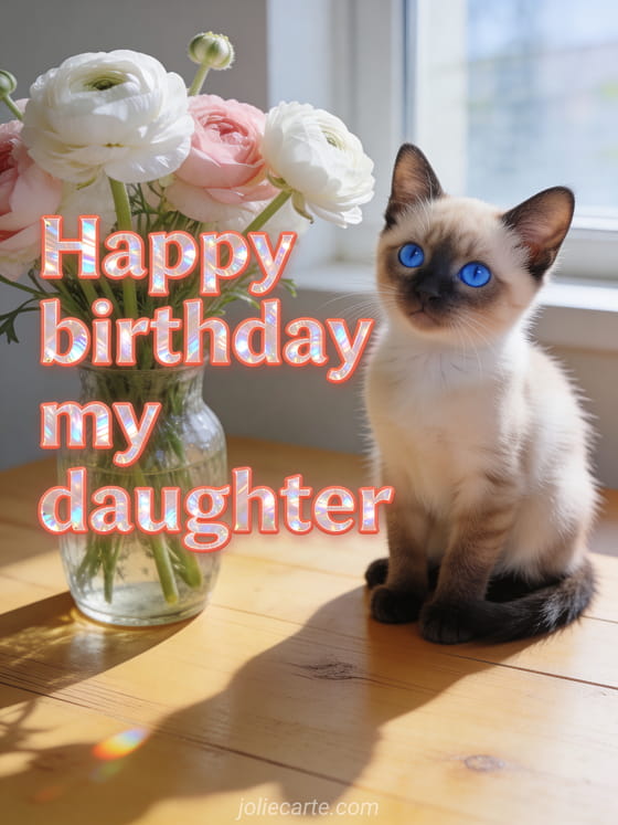 Celebrate your daughter's birthday with this beautiful photorealistic card featuring an adorable Siamese kitten with blue eyes next to a vase of pink and white ranunculus. Discover also a funny birthday card for daughter or a birthday card for daughter with love.