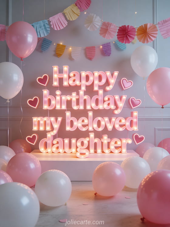Celebrate your daughter's birthday with this beautiful free greeting card. Glowing pink letters with heart effects, pink and white balloons and garlands in a joyful atmosphere. Discover also a happy birthday daughter card or a birthday fairies card.