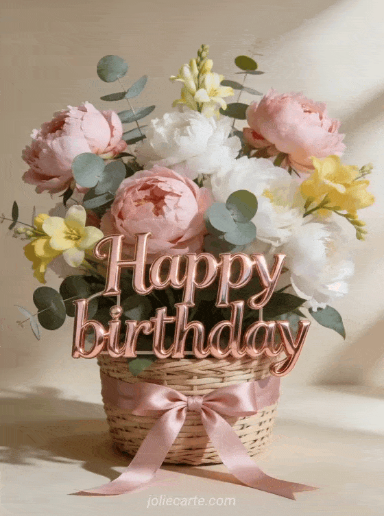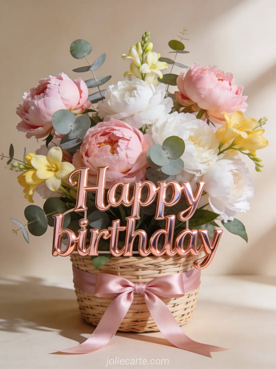 Celebrate a friend's birthday with this elegant card featuring rose gold metallic letters, pink and white peonies with eucalyptus and yellow freesia in a wicker basket tied with a pink satin ribbon, in a feminine and chic atmosphere. Also discover a friendship birthday card with ginger cat or a friendship card with sunset.