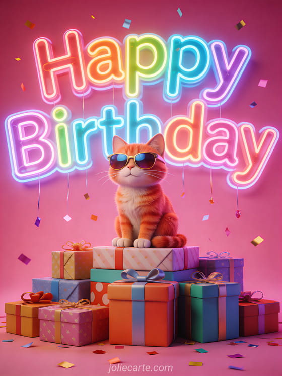 Send this festive birthday card with a cool ginger cat in sunglasses sitting on wrapped gifts with neon lights and confetti. Discover also a funny otter birthday card or a glamorous cat birthday card.