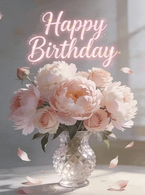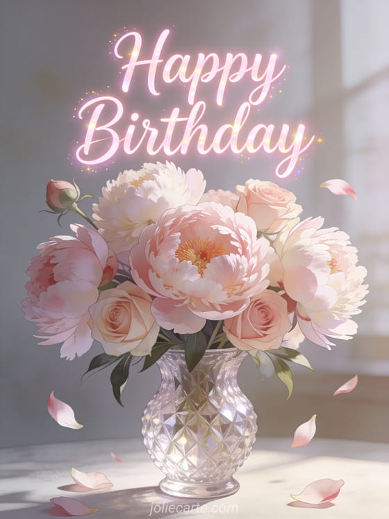 Send this enchanting happy birthday greeting featuring a magnificent bouquet of peonies and roses in a crystal vase with petals gently falling, bathed in soft natural light. Discover also a fireworks birthday animated card or a flowers birthday animated card.