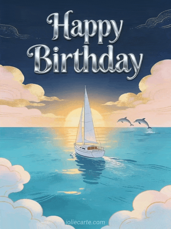 Send a peaceful happy birthday greeting with an elegant sailboat gliding on a turquoise sea at sunset to celebrate someone's special day. Discover also an animated birthday horse gif or an animated talking birthday card.
