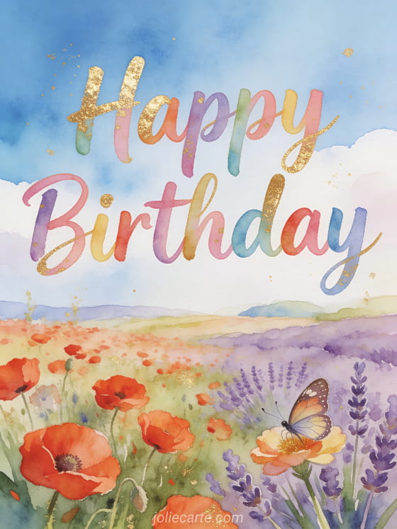 Send a joyful happy birthday greeting with a beautiful spring watercolor landscape. Discover also a happy birthday phrase card or a watercolor happy birthday card.