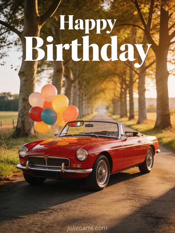 Send this charming happy birthday greeting featuring a magnificent vintage red convertible parked on a tree-lined country road with colorful balloons tied to the mirror, bathed in golden hour light. Discover also a birthday ecard.