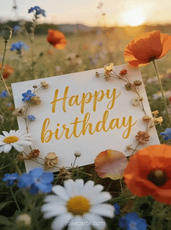 Celebrate a special birthday with this beautiful card featuring a field of wildflowers at golden hour. Discover also a free happy birthday image or a birthday wishes card.