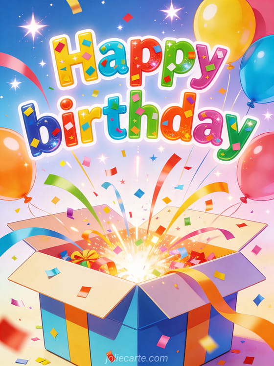 Surprise someone on their birthday with this fun card featuring a giant gift box exploding with colorful confetti and balloons flying up. Discover also a happy birthday card with roses or a happy birthday card with daffodils.