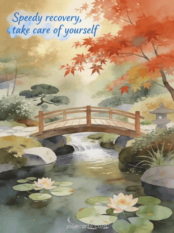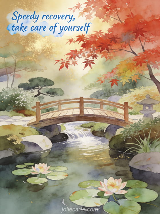 Send this beautiful get well card featuring a zen Japanese garden with a wooden bridge and blooming water lilies to wish someone a speedy recovery. Discover also a get well soon my love card or a healing love quote card or a get well soon card.