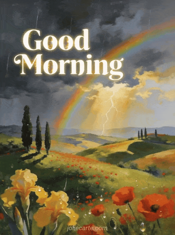 Send a warm Good Morning greeting with a beautiful Tuscan landscape of green hills, red poppies and a rainbow. Discover also a good morning kisses card or a funny good morning animated card.