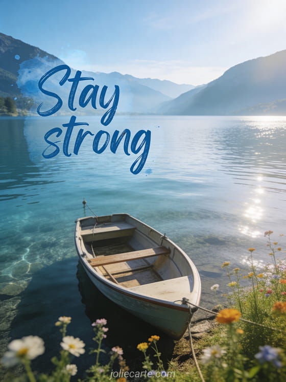 Send this beautiful encouragement card featuring a serene lakeside landscape with mountains and a moored boat to bring peace to someone. Discover also a funny stay strong card or a stay strong card for difficult times or a free encouragement card.