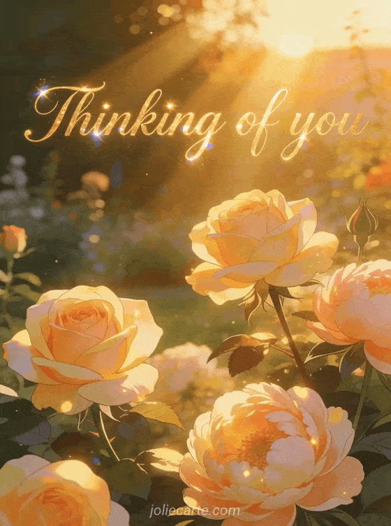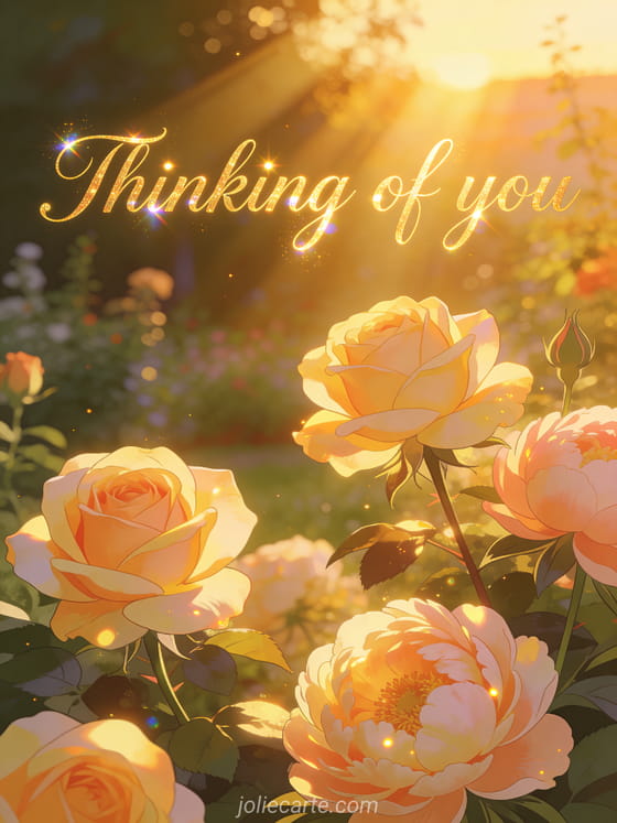 Send a heartfelt thinking of you greeting with roses and peonies in a golden sunset garden. Discover also a thinking of you animated gif or a I think of you every moment card.