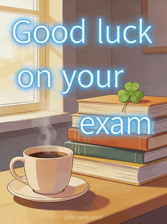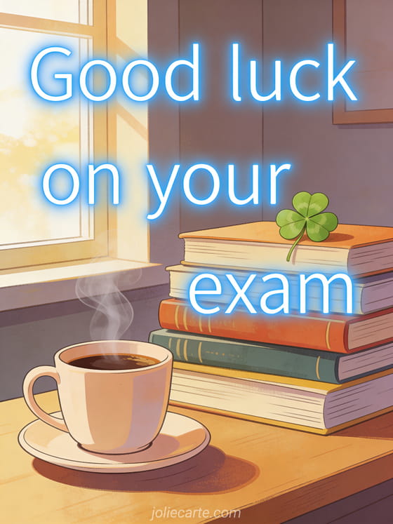 Encourage someone before their exam with this warm good luck card. A desk with stacked books and a steaming coffee cup, a four-leaf clover resting on the books, with soft morning light streaming through a window.