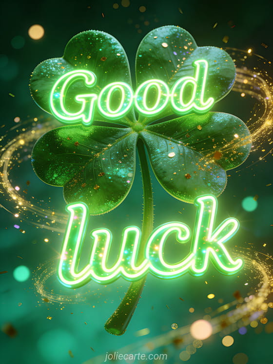 Wish someone good luck with this magical greeting card. A giant four-leaf clover glows with golden glitter swirling around it, against a deep emerald green background with luminous dots, creating a lucky and magical atmosphere.