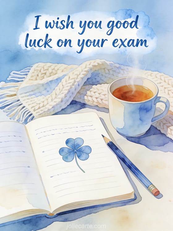 Send a heartfelt good luck wish for an exam with this cozy card featuring a notebook and four-leaf clover. Discover also a good luck exam gif or a good luck exam wishes card.