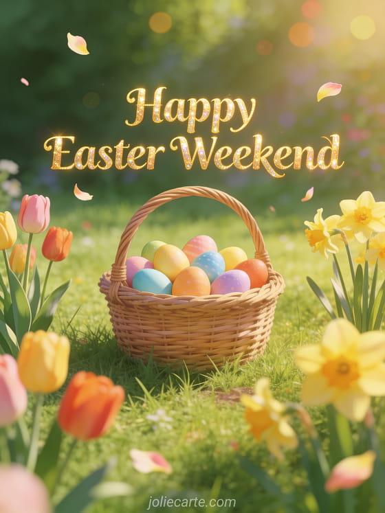 Celebrate the Easter weekend with this charming card featuring a wicker basket full of colorful eggs in a blooming spring garden. You may also enjoy a happy Easter weekend greeting for everyone.