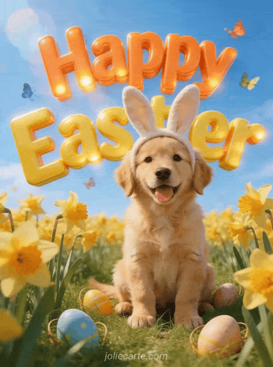 Share this adorable Easter greeting featuring a golden retriever puppy wearing bunny ears sitting in a field of daffodils with Easter eggs hidden in the grass and colourful butterflies. Discover also an Easter bunny gif card.