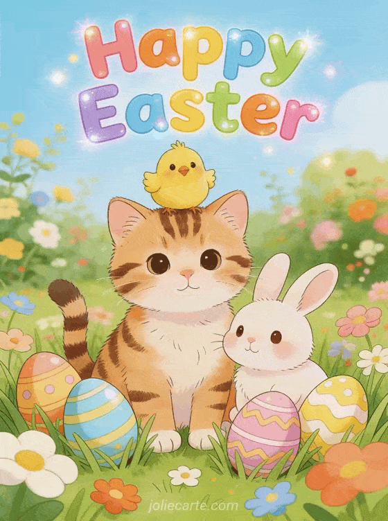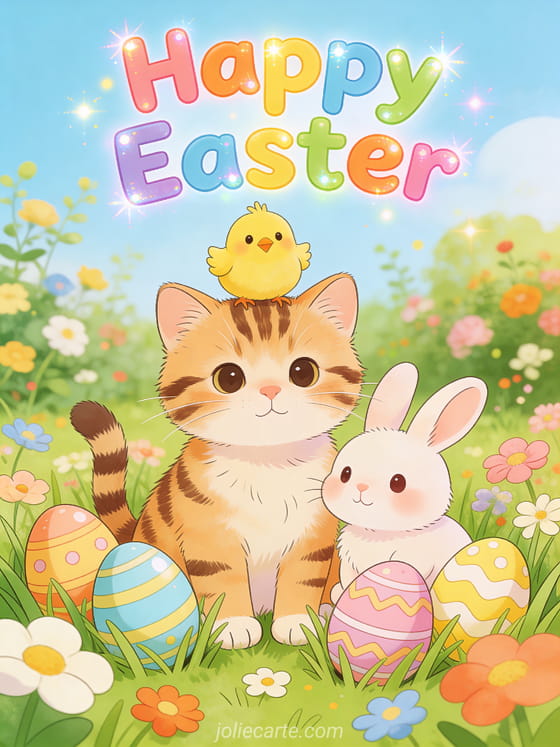 Share this joyful Easter greeting featuring adorable animals in an Easter garden: a chick on a tabby kitten's head, a little rabbit nearby, surrounded by decorated eggs in the flowering grass. Discover also an Easter bunny video card or an Easter bunny gif card.