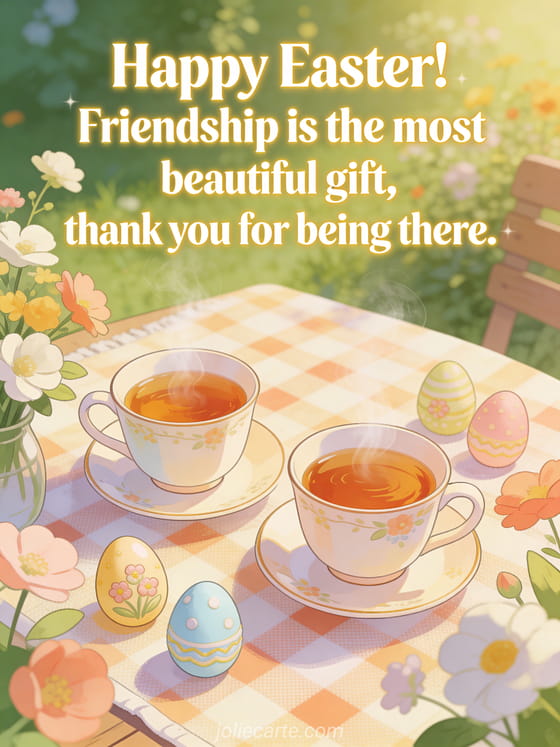 Send warm Easter wishes to a dear friend with this beautiful card celebrating friendship. Discover also a Happy Easter greeting, a free Easter image to download or an Easter illustration.
