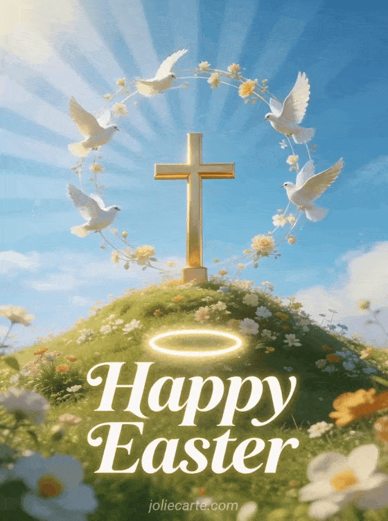 Celebrate the joy of Easter with this luminous religious card featuring a golden cross surrounded by white doves on a spring hillside. You may also enjoy a religious happy Easter greeting.