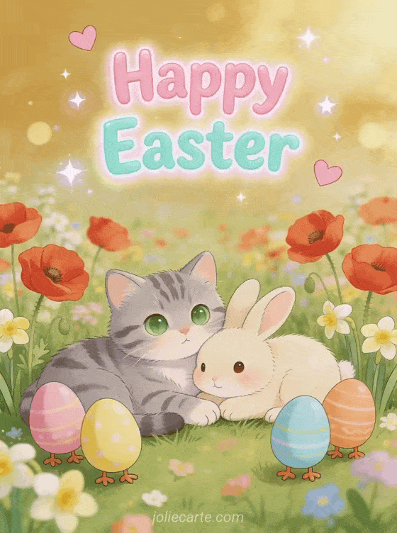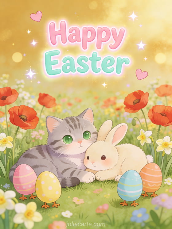 Delight the little ones with this adorable Happy Easter card featuring a tabby kitten and a bunny cuddled together in a field of poppies and daisies, surrounded by colorful Easter eggs. A kawaii illustration full of joy and tenderness. Discover also an Easter animals card or a Easter bunny video card.