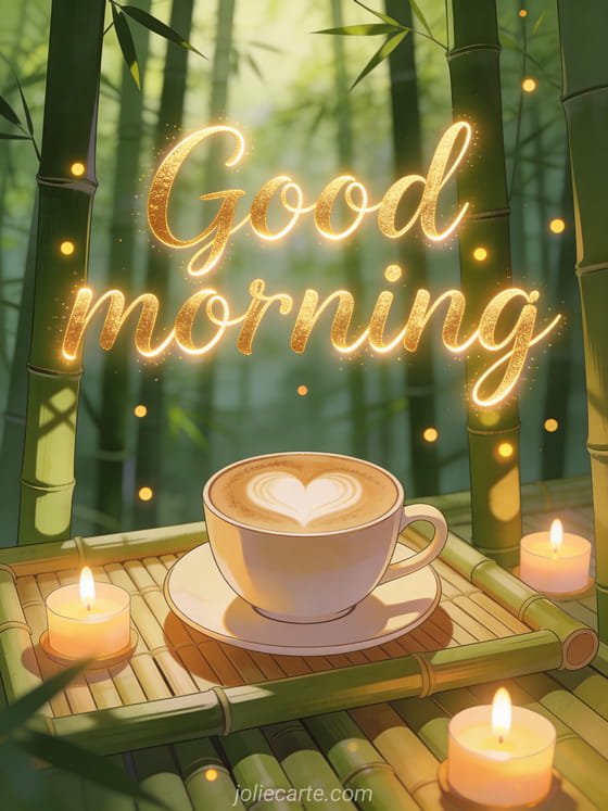 Send a peaceful good morning with this zen coffee card. A latte art heart coffee cup sits on a bamboo tray in a bamboo grove, with lit candles arranged around it, light filtering through tall green bamboo and luminous dots floating in the air. Discover also a good morning flower boat coffee card, a good morning seaside coffee card or a good morning kisses coffee card.