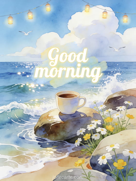 Start the day with a breath of fresh air by sending this beautiful good morning coffee card. A coffee cup sits on a smooth seaside rock with gentle waves, white and yellow daisies growing between the rocks, seagulls flying in the distance and sparkling lanterns. Discover also a good morning kisses coffee card or a I miss you card.