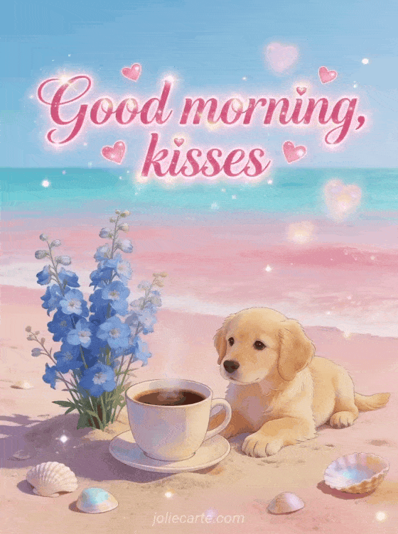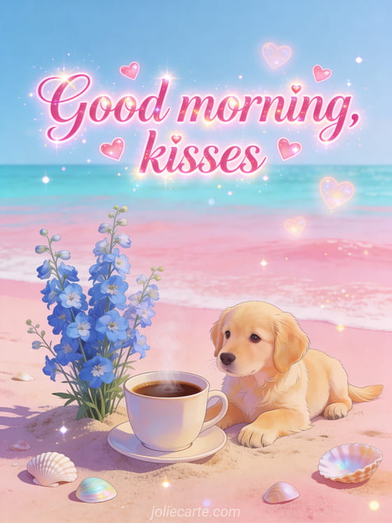 Send a warm good morning with this tender coffee card. A steaming coffee cup sits on the pink sand of a pastel beach alongside blue delphiniums and a golden retriever puppy with a loving gaze, while glowing hearts float in the air. Discover also a I miss you card.