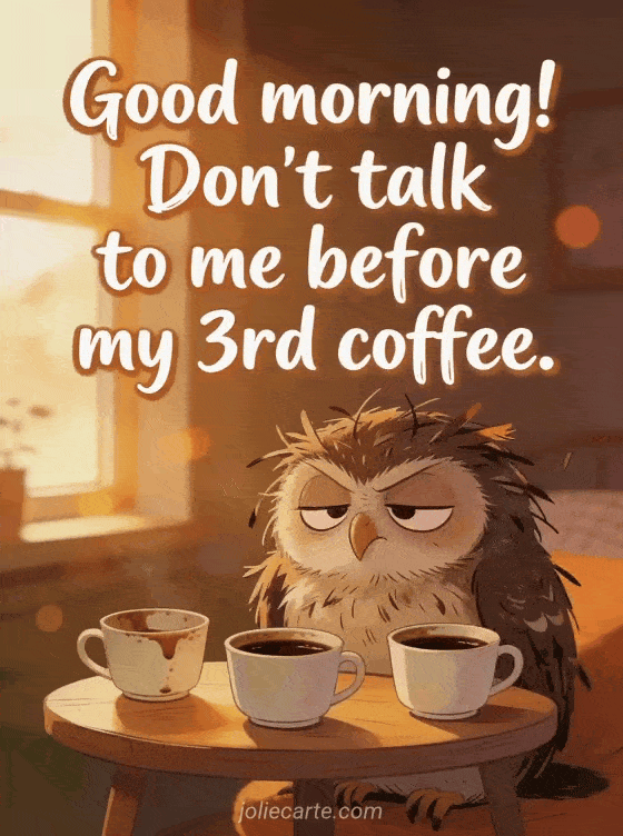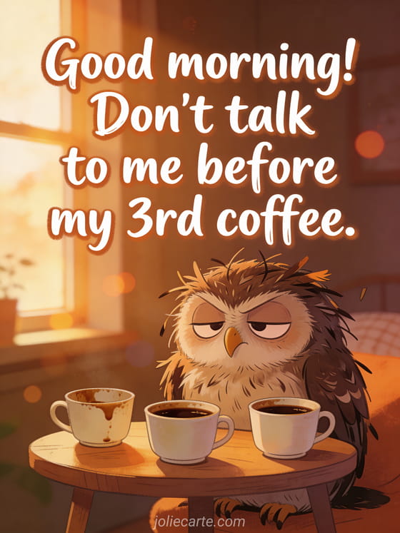 Start the day with a laugh by sending this humorous good morning card. A disheveled owl sits grumpily in front of three empty coffee cups, perfectly capturing the pre-caffeine mood. Discover also a funny good morning card.