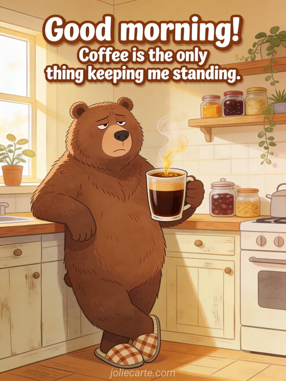 Brighten someone's morning with this hilarious good morning card. A big brown bear in plaid slippers leans against a rustic kitchen counter, clutching a giant coffee cup with a sleepy but determined look. Discover also a funny bed morning card, a funny smile morning card or a humorous autopilot morning card.